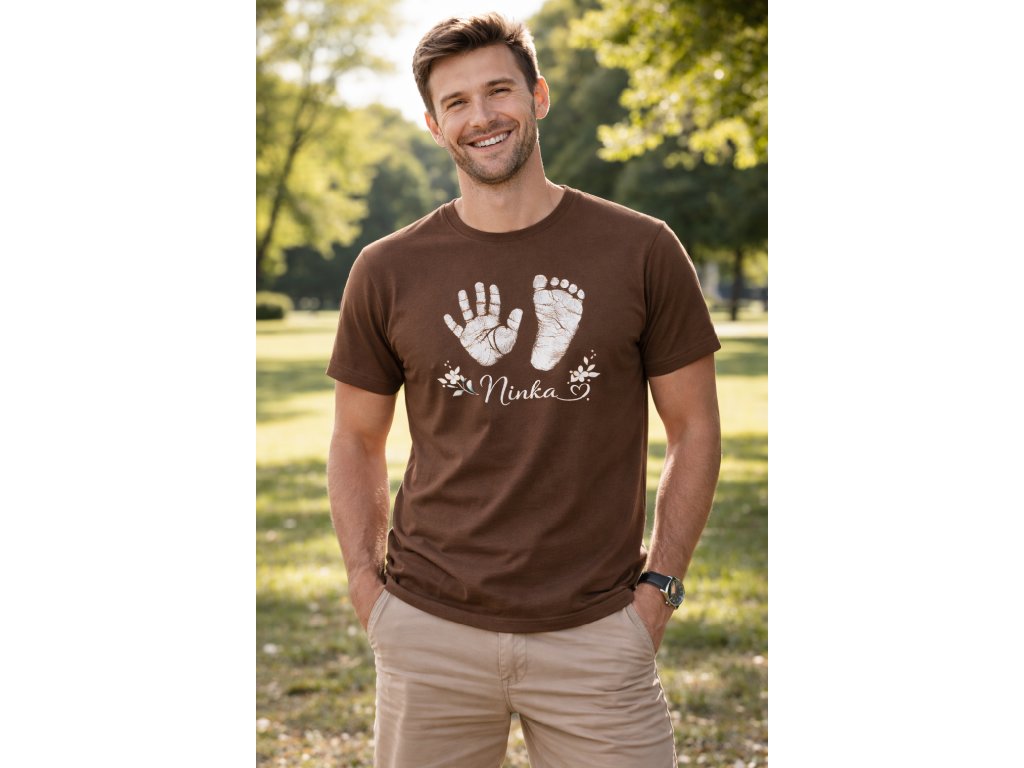 Na tričku sú reálne odtlačky dieťatka doplnené o meno v elegantnom a čistom dizajne. Minimalistické prevedenie je jemné, nositeľné a zároveň emocionálne silné – presne tak, aby si ho oco mohol obliecť bežne, no stále cítil, že na hrudi nosí niečo výnimočné.